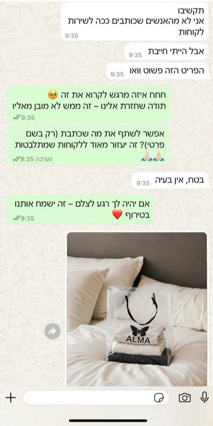 התלבטתי אם זה יתאים לי, אבל כשזה הגיע – נמסתי 🥹 הרבה יותר יפה ומיוחד ממה שחשבתי. שירות לקוחות מהיר ברמות – תוך חמש דקות ענו לי, והמשלוח הגיע בצ’יק.
