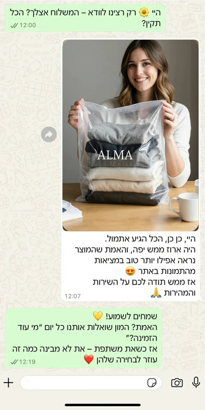 הסטייל שלי עלה רמה בלי להתאמץ בכלל. פתאום הכל נראה מושקע, בלי שבאמת התאמצתי 😍. צוות אלמה מודה עזר לי לבחור צבעים וענה ממש מהר. חוויית קנייה מושלמת.