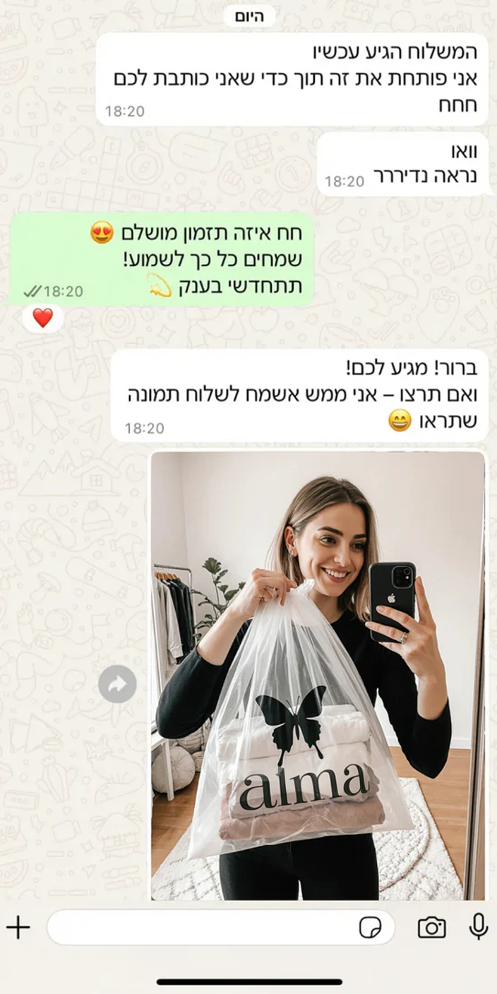 אני לא קונה הרבה אונליין, אבל כאן ממש התרגשתי לפתוח את החבילה – הכל היה עטוף מהמם, עם ריח טוב, כאילו שלחו לי סטייל עד הבית. שירות אדיב ומקצועי. ממליצה בחום!